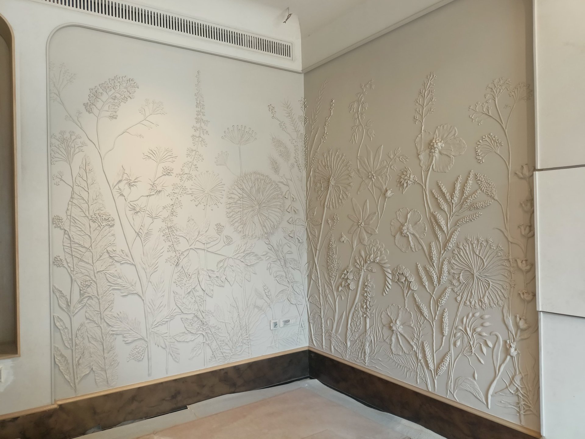 Custom bas-relief wall murals featuring floral, vine, and mythological themes.